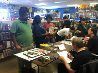 I arrived at about 11:30 and left like at 1:30 or 2:00. I had promised my good friend, Miles, that I would go support the JLA NM and meet the rest of the gang. I already knew Noel, but was glad to meet Tye and Danielle. As me and my brother drove in, my brother quoted Joe Pesci from Home Alone and said, "This place is jumping." There was a plethora of comic fans there already. The parking lot was full and there hung a huge sign of the JLA NM. I looked for my buddy Miles and went to give him a hug, and met the rest of the gang. It had been more than a year since I had seen Noel. We talked for a bit, and I was waiting for my friend Max to arrive. He had called me while I was at Tall Tales and would join us at Comic Warehouse. I also saw my friends, Matthew and Ester, and their kids. Matthew is organizing the JSA NM and I will be the Golden Age Sandman in that organization.